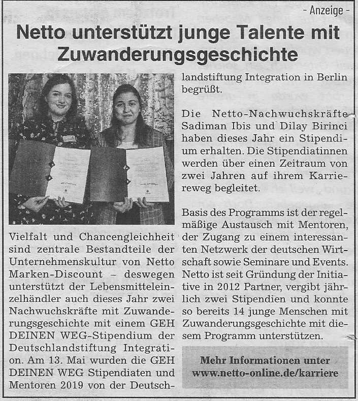 Netto unterstützt die Initiative „Geh‘ Deinen Weg“, ein Stipendienprogramm für junge Menschen mit Zuwanderungs- geschichte. Die Deutschlandstiftung Integration, die unter der Schirmherrschaft von Bundeskanzlerin Dr. Angela Merkel steht, rief diese Initiative ins Leben. Das zweijährige Stipendienprogramm bietet bundesweit 150 jungen Menschen aus unterschiedlichen Branchen erstklassige Seminare zu Themen wie Führung oder Persönlichkeitsentwicklung an. Unter anderem wurden auch zwei Junge Damen mit Zuwanderungsgeschichte mit dieser Initiative unterstützt, den Artikel dazu können sie hier nachlesen. Weiteres gibt es auf Nettos Homepage.