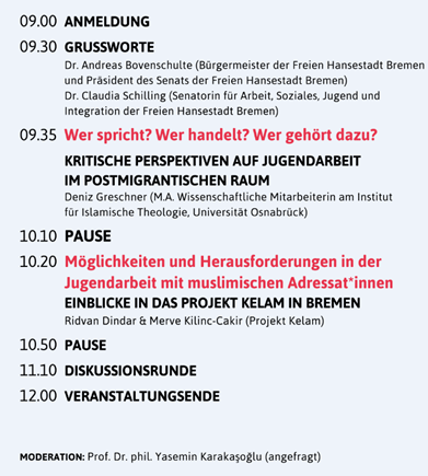 Das Demokratiezentrum des Landes Bremen und das Projekt kelam der Schura Bremen laden Sie herzlich dazu ein, gemeinsam zu diskutieren, wie Moscheevereine ihre eigenen pädagogischen Ansätze in der Jugendarbeit stärken und professionalisieren können – und was es braucht, damit Fachkräfte postmigrantische Realitäten nicht als Problem, sondern als Ausgangspunkt solidarischer Praxis verstehen.